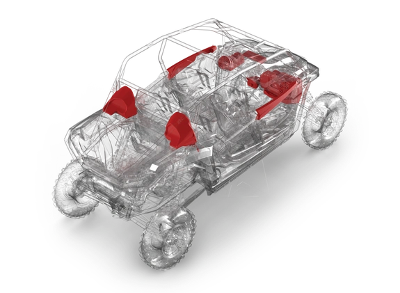 - Rear speaker pods do not interfere with Polaris® branded spare tire carrier, coolers, or storage boxes